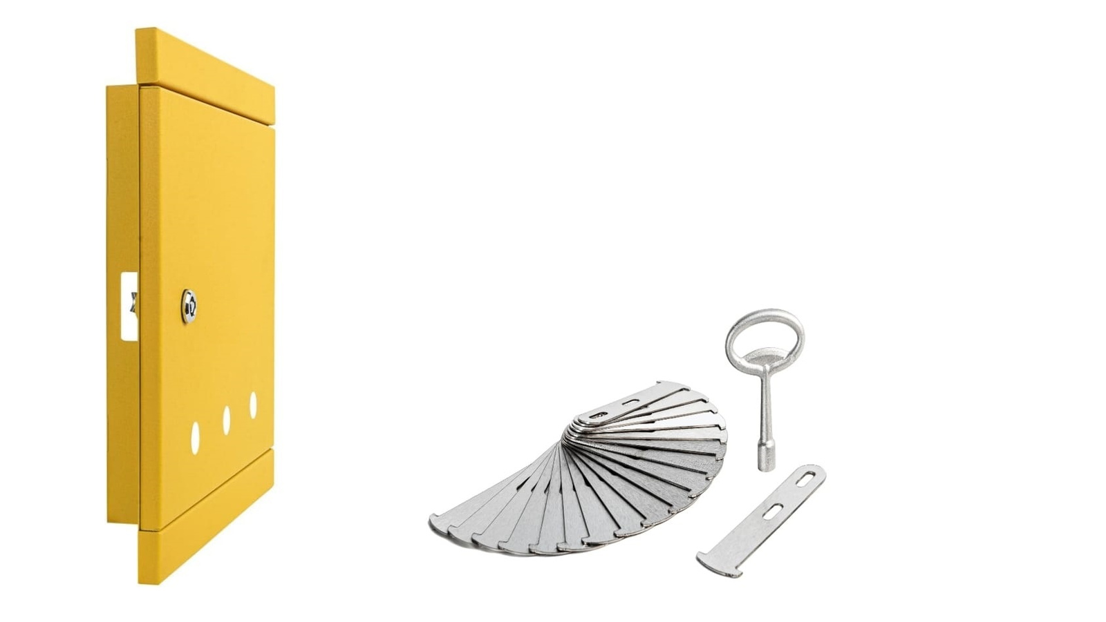 The door has a cut-out for - reading the meters. The set also includes a lock, a universal key and 8 mounting anchors.